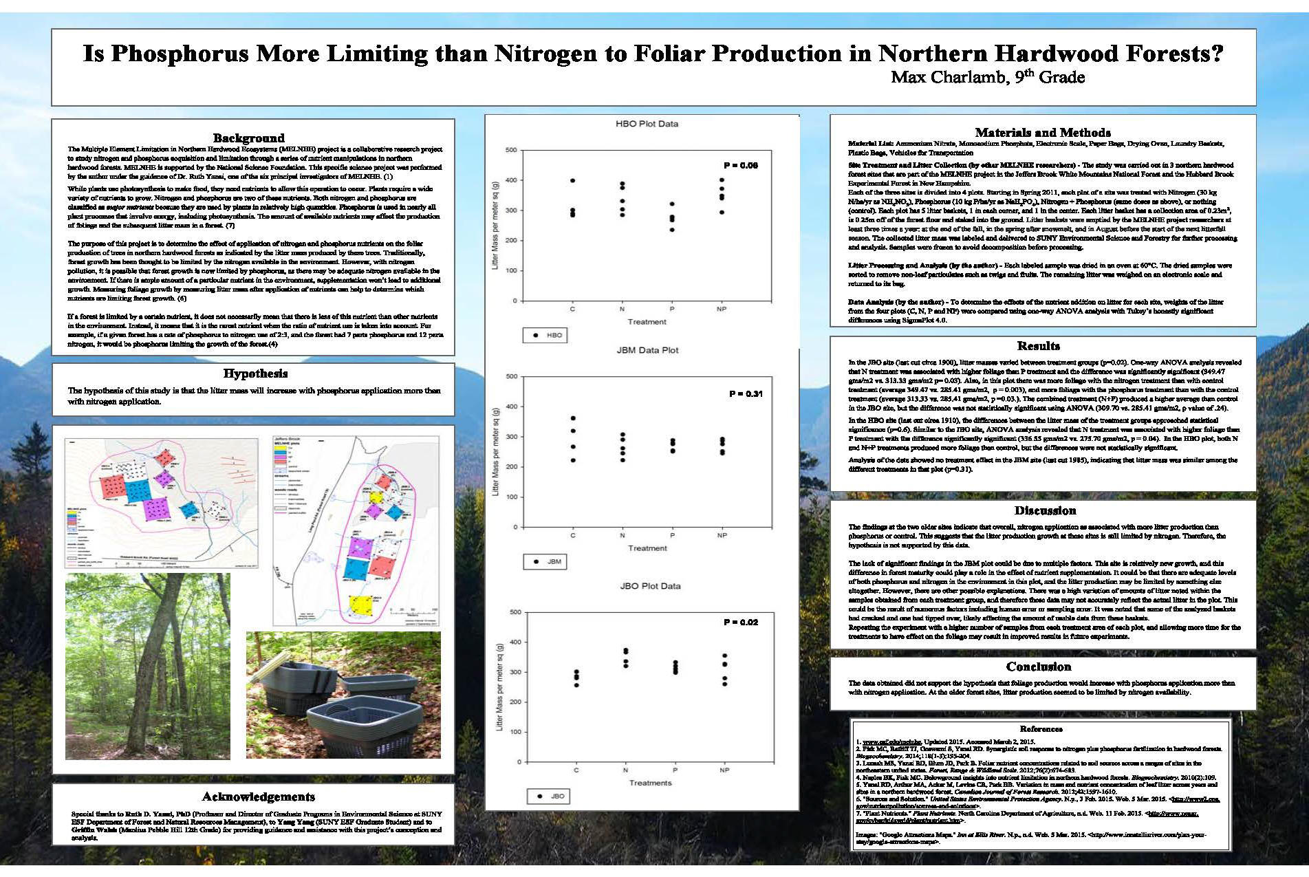 MELNHE featured at 2015 Central New York Science & Engineering Fair, Mar 22, 2015. Max Charlamb, a 9th grader at Manlius Pebble Hill School in Dewitt, NY, has been working with Dr. Ruth Yanai, through a Research Assistantship for High School Students supplement to analyze project data. His poster entitled "Is phosphorus more limiting than nitrogen to foliar production in Northern Hardwood Forests" earned High Honors in the Senior Division (grades 9-12). He concluded that data do not support the hypothesis that foliage production would increase with P application more than with N. At the older sites, litter production seemed limited by N availability. The CNYSEF accepts projects from students in grades 4-12 from public, private and independent schools and homeschooled students in Onondaga, Madison, Oswego, Cayuga and Cortland counties. The Fair is one of several annual STEM competitions administered through the Museum of Science and Technology, located in downtown Syracuse's historic Armory Square. poster