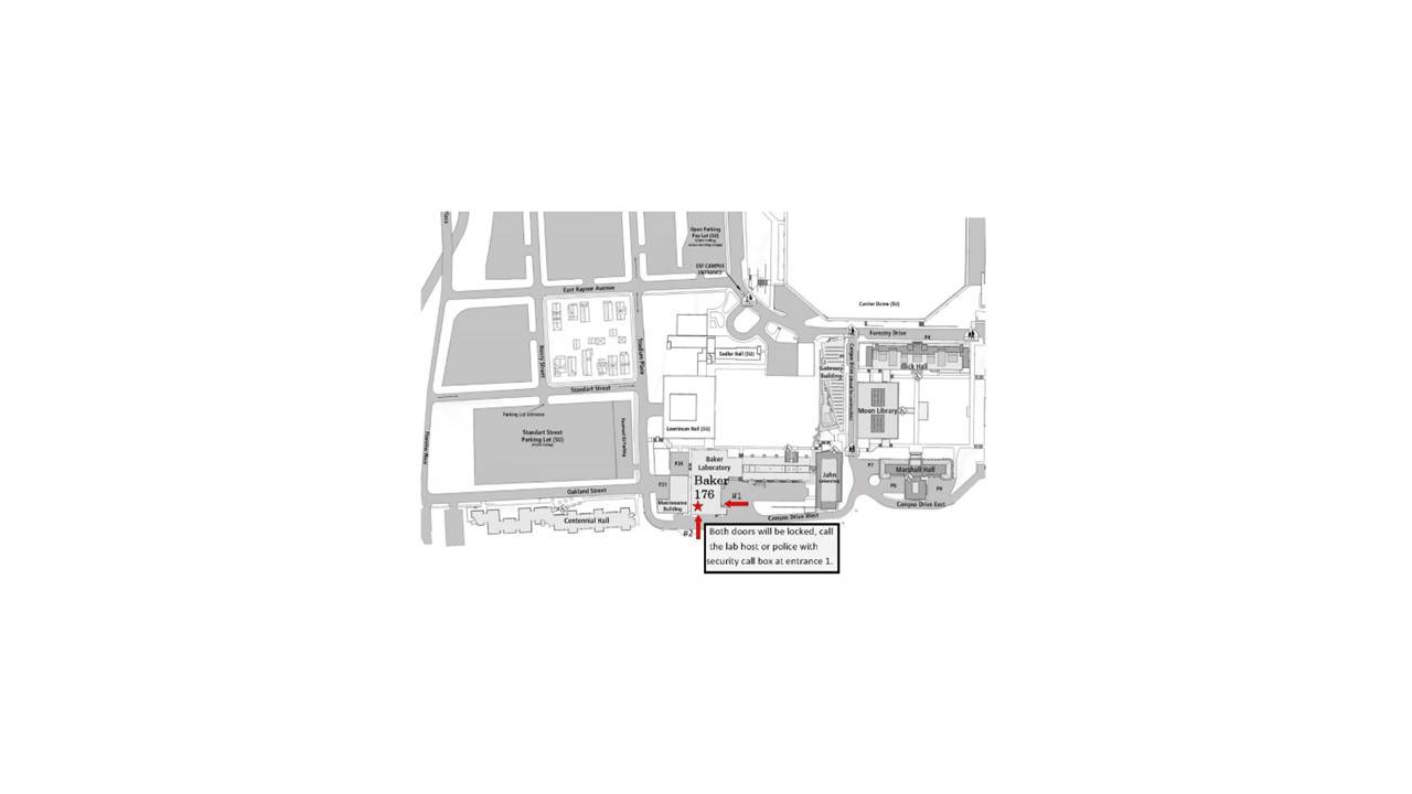 The door will be locked, call 315-565-3002 (lab phone) or the lab host. You may also use the campus police box located near the door. Simply press “Call” or dial x6667 for non-emergency (x6666 for emergencies) and ask them to unlock the door.